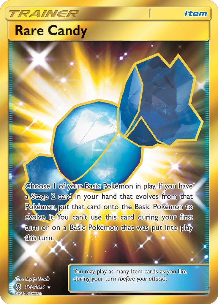 - Choose 1 of your Basic Pokémon in play. If you have a Stage 2 card in your hand that evolves from that Pokémon, put that card onto the Basic Pokémon to evolve it. You can't use this card during your first turn or on a Basic Pokémon that was put into play this turn.