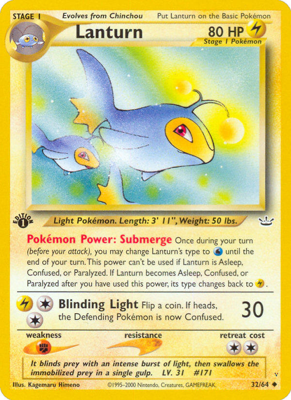 Once during your turn (before your attack), you may change Lanturn's type to Water until the end of your turn. This power can't be used if Lanturn is Asleep, Confused, or Paralyzed. If Lanturn becomes Asleep, Confused, or Paralyzed after you have used this power, its type changes back to Lightning.