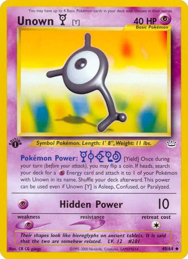 Once during your turn (before your attack), you may flip a coin. If heads, search your deck for a Psychic Energy card and attach it to 1 of your Pokémon with Unown in its name. Shuffle your deck afterward. This power can be used even if Unown [Y] is Asleep, Confused, or Paralyzed.
