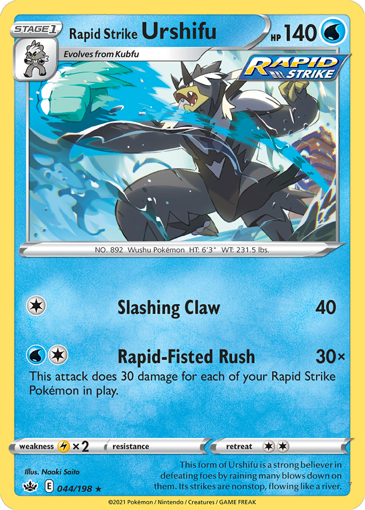 This form of Urshifu is a strong believer in defeating foes by raining many blows down on them. Its strikes are nonstop, flowing like a river.