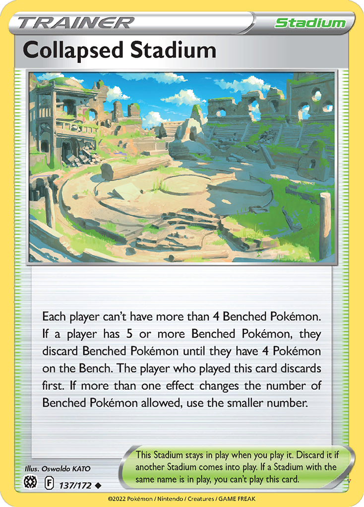 - Each player can't have more than 4 Benched Pokémon. If a player has 5 or more Benched Pokémon, they discard Benched Pokémon until they have 4 Pokémon on the Bench. The player who played this card discards first. If more than one effect changes the number of Benched Pokémon allowed, use the smaller number.