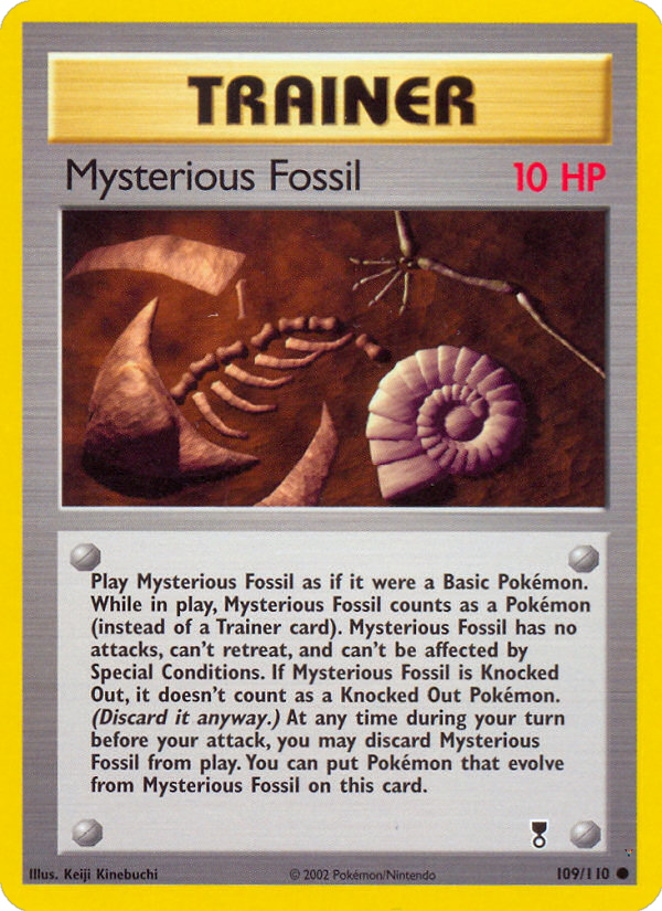 - Play Mysterious Fossil as if it were a Basic Pokémon. While in play, Mysterious Fossil counts as a Pokémon (instead of a Trainer card). Mysterious Fossil has no attacks, can't retreat, and can't be affected by Special Conditions. If Mysterious Fossil is Knocked Out, it doesn't count as a Knocked Out Pokémon. (Discard it anyway.) At any time during your turn before your attack, you may discard Mysterious Fossil from play. You can put Pokémon that evolve from Mysterious Fossil on this card.