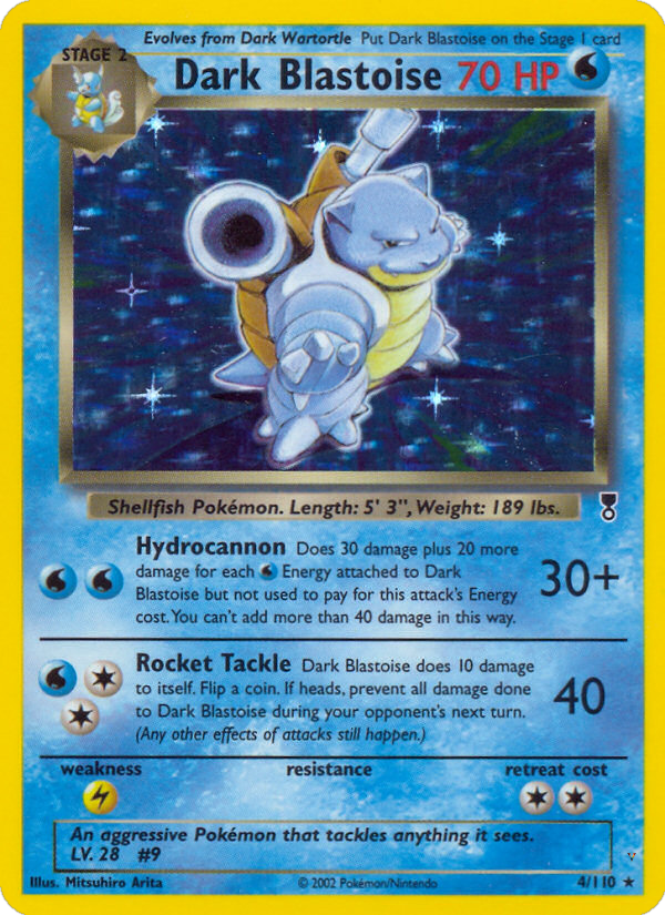 Dark Blastoise does 10 damage to itself. Flip a coin. If heads, prevent all damage done to Dark Blastoise during your opponent's next turn. (Any other effects of attacks still happen.)