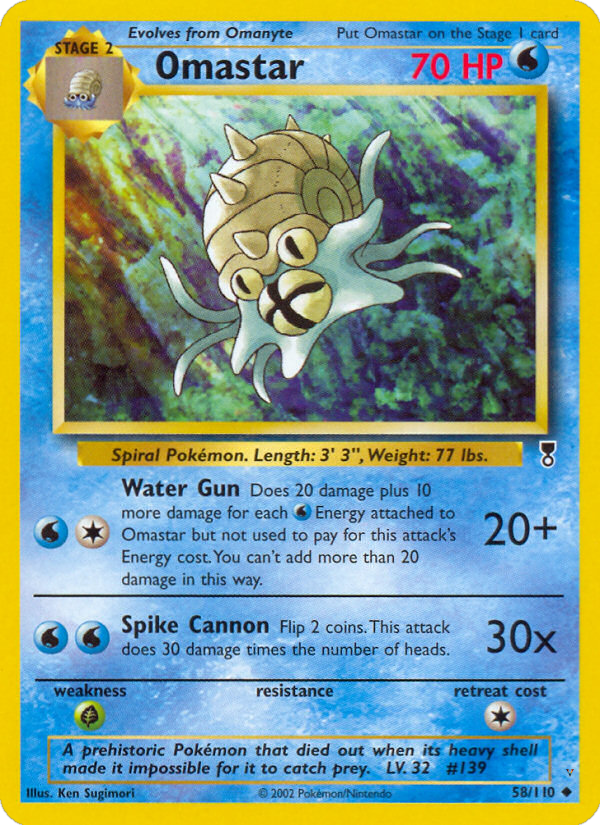 Does 20 damage plus 10 more damage for each Water Energy attached to Omastar but not used to pay for this attack's Energy cost. You can't add more than 20 damage in this way.