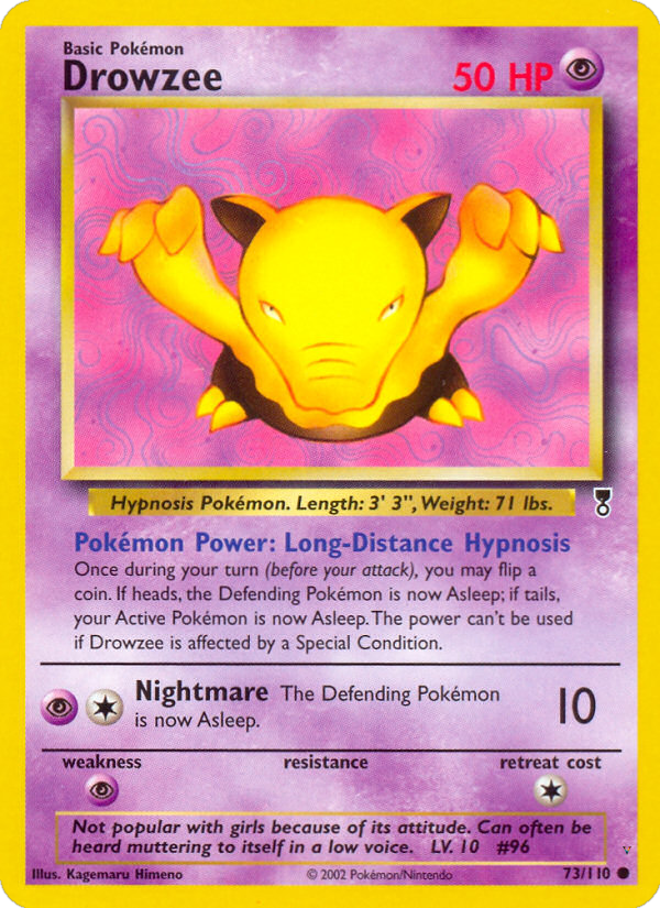 Once during your turn (before your attack), you may flip a coin. If heads, the Defending Pokémon is now Asleep; if tails, your Active Pokémon is now Asleep. The power can't be used if Drowzee is affected by a Special Condition.