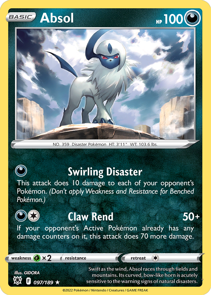 Swift as the wind, Absol races through fields and mountains. Its curved, bow-like horn is acutely sensitive to the warning signs of natural disasters.