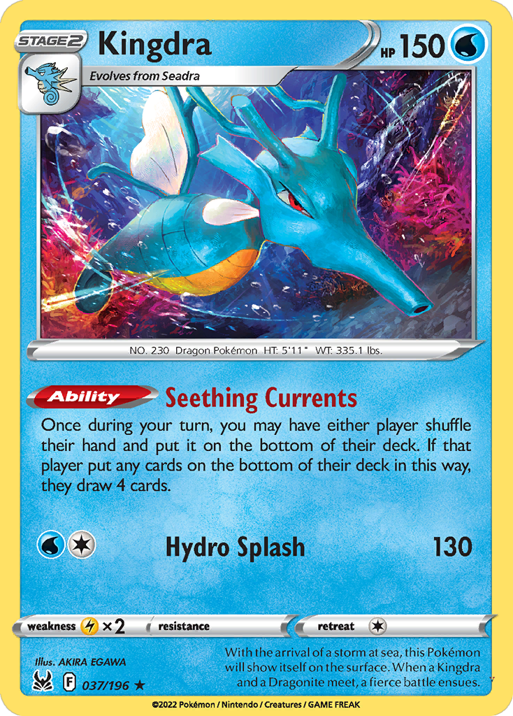 With the arrival of a storm at sea, this Pokémon will show itself on the surface. When a Kingdra and a Dragonite meet, a fierce battle ensues.