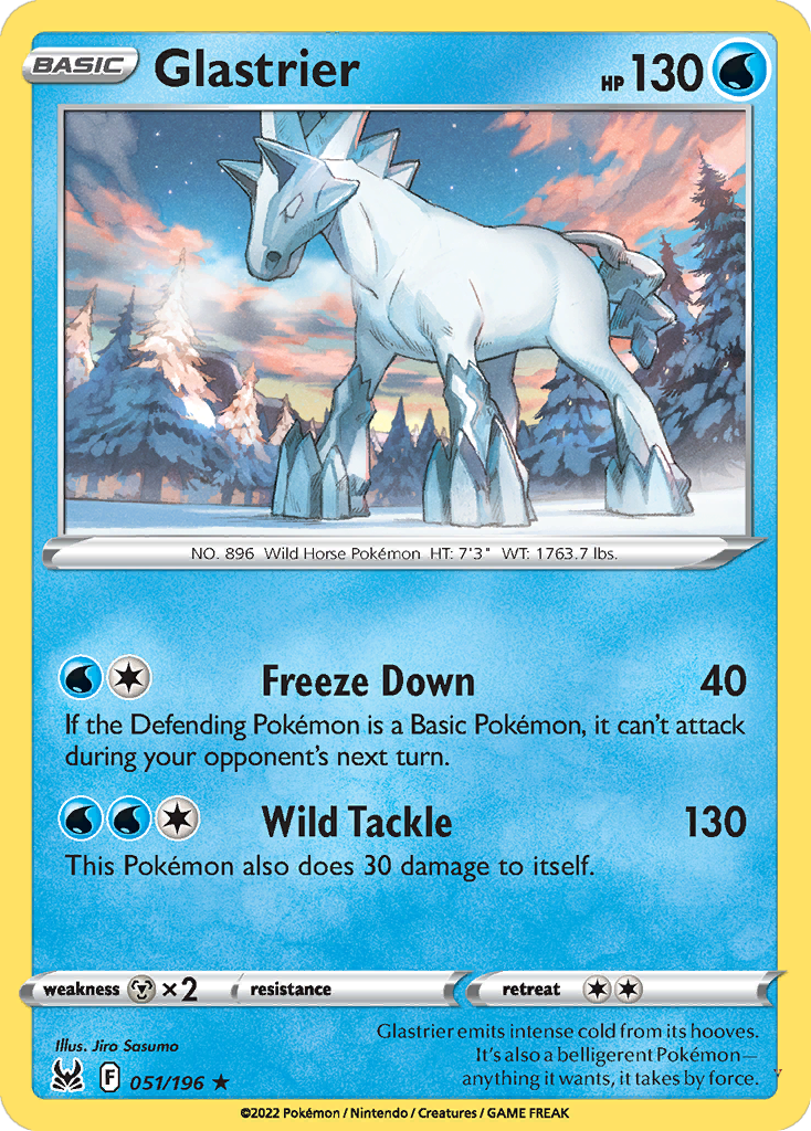 Glastrier emits intense cold from its hooves. It's also a belligerent Pokémon—anything it wants, it takes by force.