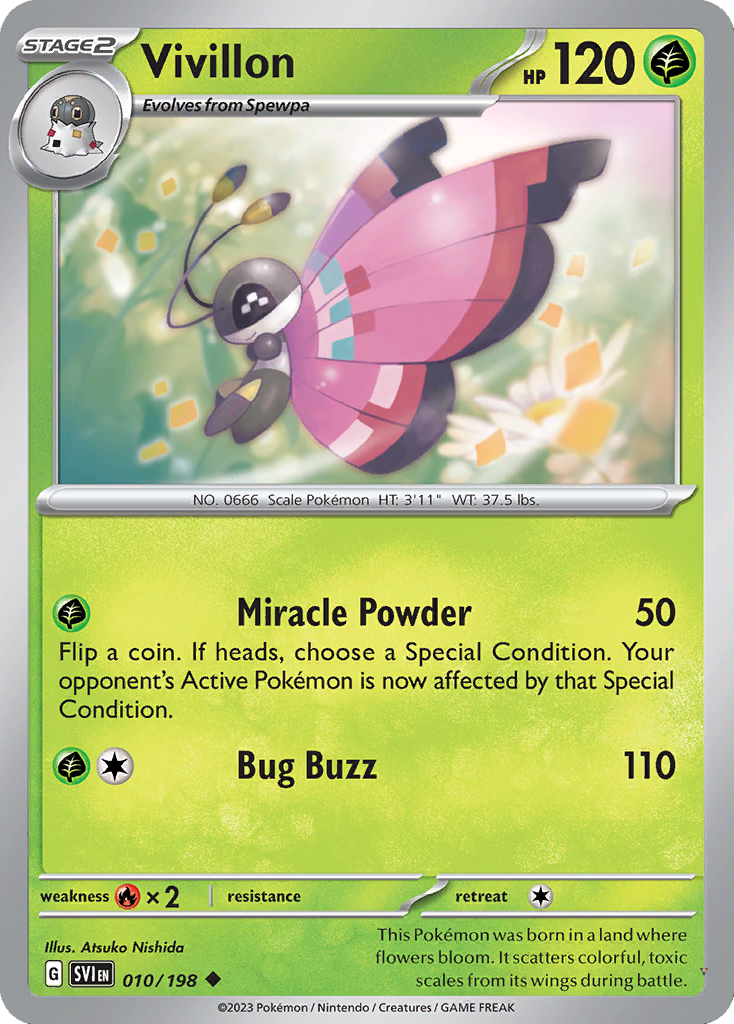 This Pokémon was born in a land where flowers bloom. It scatters colorful, toxic scales from its wings during battle.
