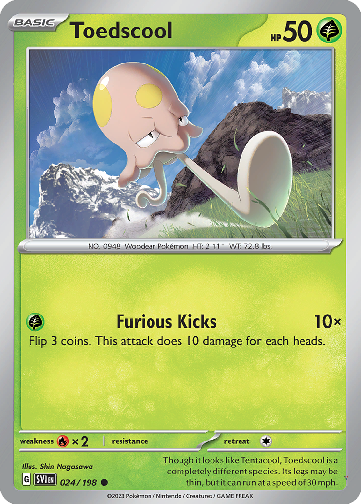 Though it looks like Tentacool, Toedscool is a completely different species. Its legs may be thin, but it can run at a speed of 30 mph.
