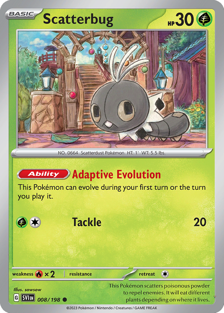 This Pokémon scatters poisonous powder to repel enemies. It will eat different plants depending on where it lives.