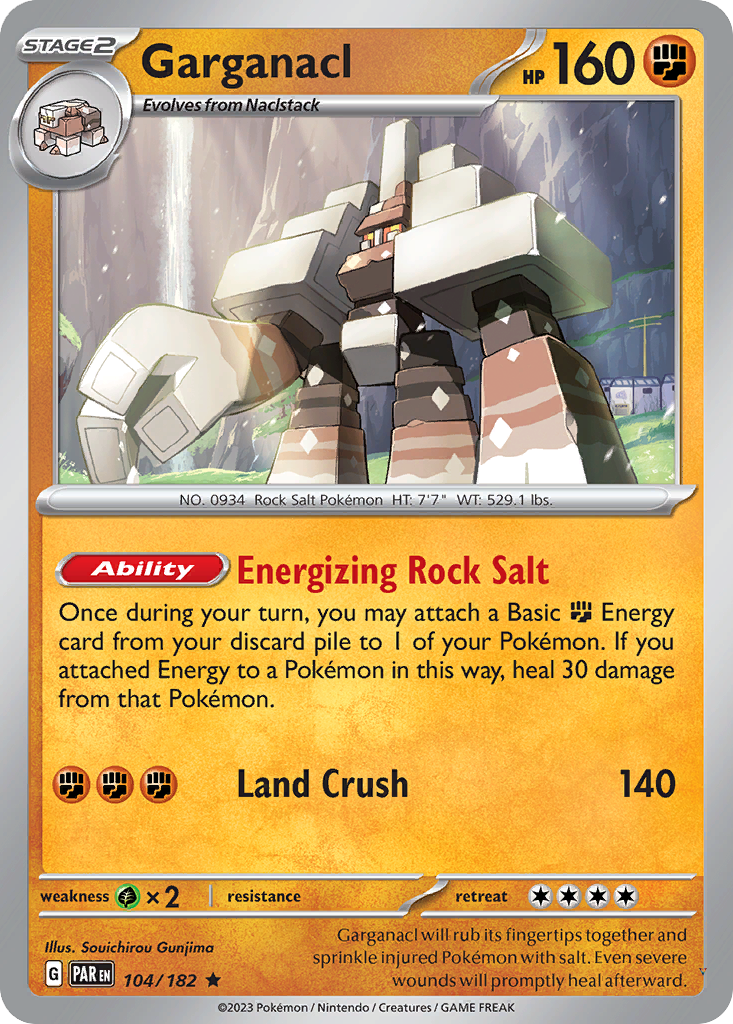 Garganacl will rub its fingertips together and sprinkle injured Pokémon with salt. Even severe wounds will promptly heal afterward.
