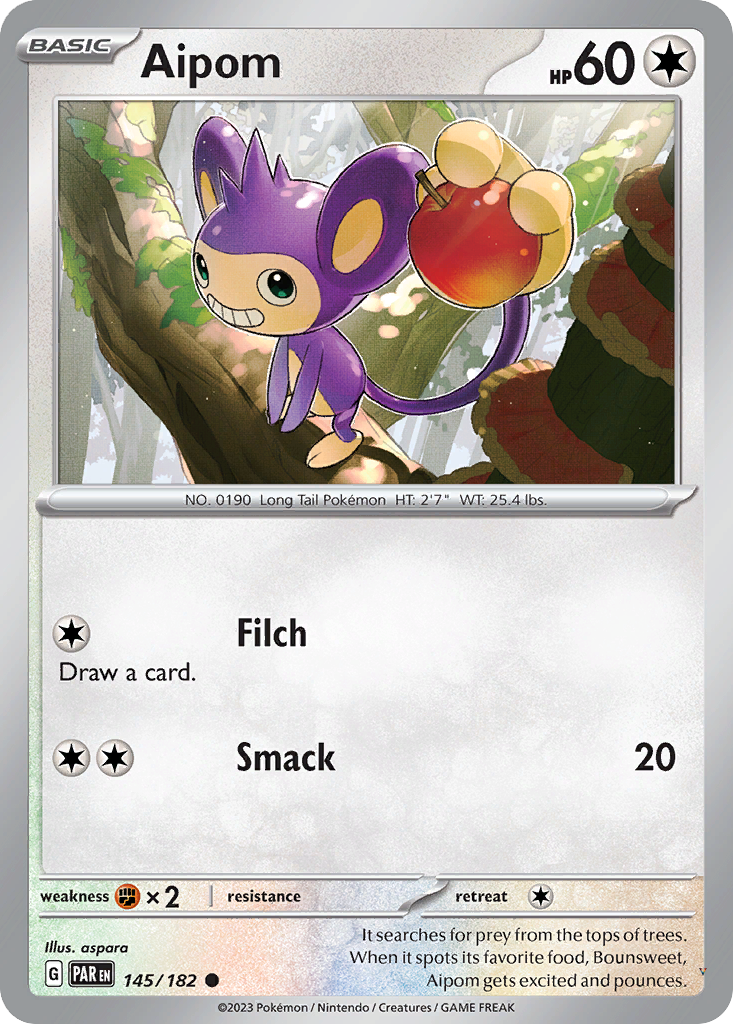 It searches for prey from the tops of trees. When it spots its favorite food, Bounsweet, Aipom gets excited and pounces.