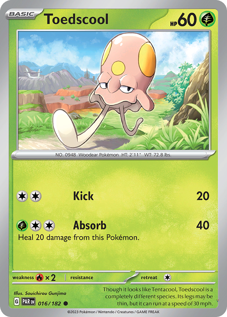 Though it looks like Tentacool, Toedscool is a completely different species. Its legs may be thin, but it can run at a speed of 30 mph.