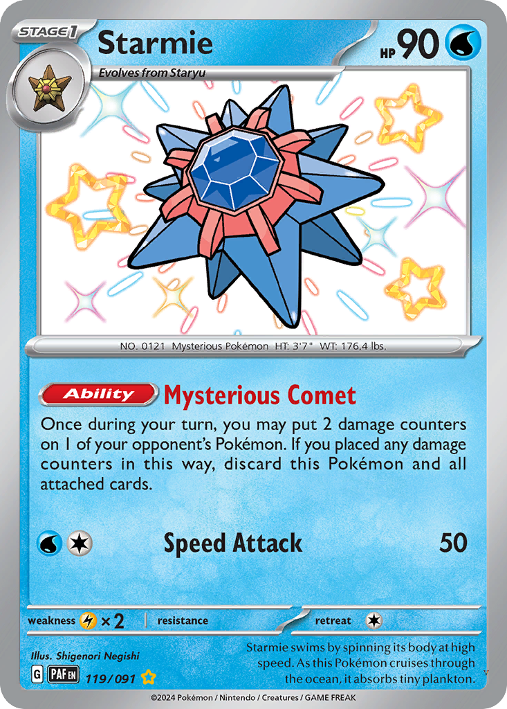 Starmie swims by spinning its body at high speed. As this Pokémon cruises through the ocean, it absorbs tiny plankton.
