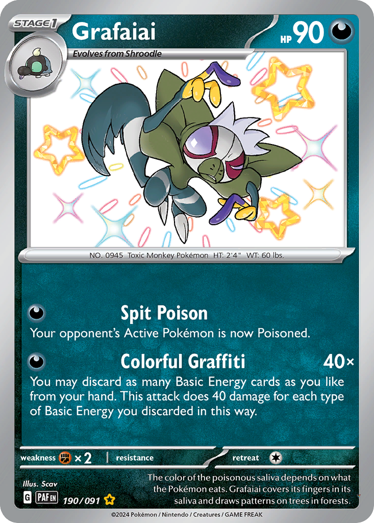 The color of the poisonous saliva depends on what the Pokémon eats. Grafaiai covers its fingers in its saliva and draws patterns on trees in forests.
