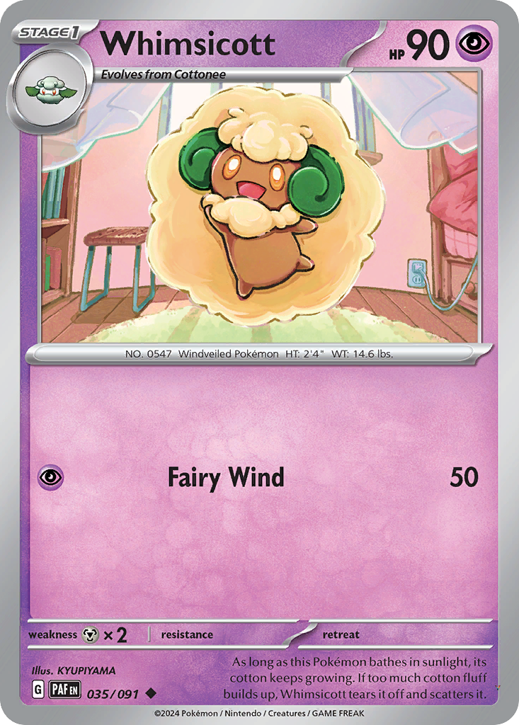 As long as this Pokémon bathes in sunlight, its cotton keeps growing. If too much cotton fluff builds up, Whimsicott tears it off and scatters it.