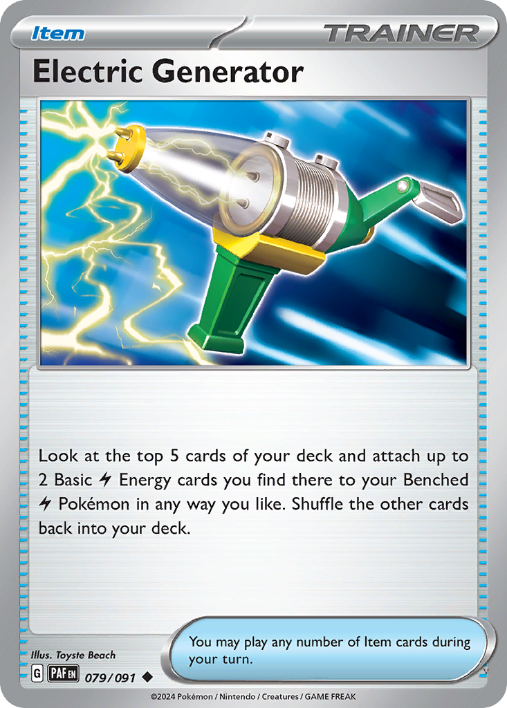Look at the top 5 cards of your deck and attach up to 2 Basic Lightning Energy cards you find there to your Benched Lightning Pokémon in any way you like. Shuffle the other cards back into your deck.