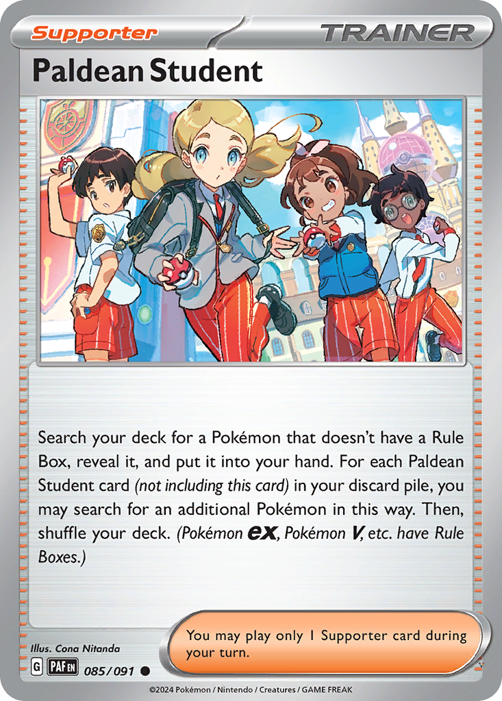 - Search your deck for a Pokémon that doesn't have a Rule Box, reveal it, and put it into your hand. For each Paldean Student card (not including this card) in your discard pile, you may search for an additional Pokémon in this way. Then, shuffle your deck. (Pokémon ex, Pokémon V, etc. have Rule Boxes.)