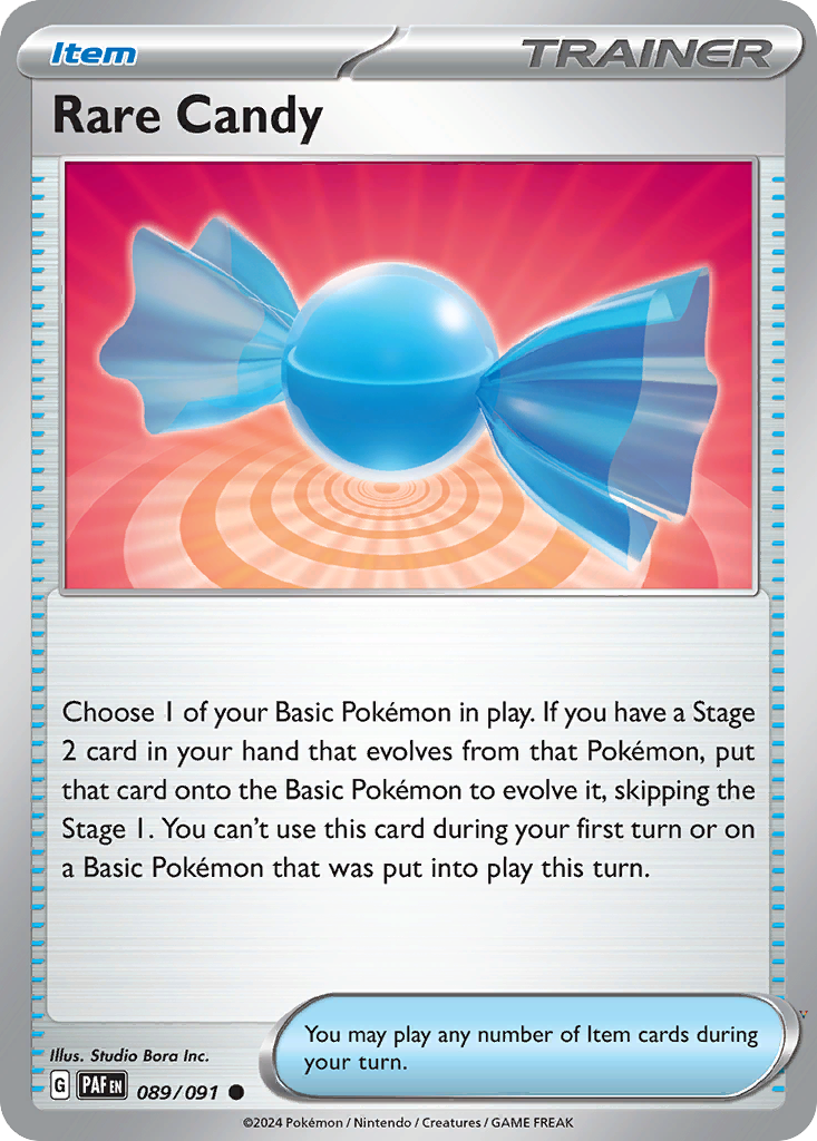 - Choose 1 of your Basic Pokémon in play. If you have a Stage 2 card in your hand that evolves from that Pokémon, put that card onto the Basic Pokémon to evolve it, skipping the Stage 1. You can't use this card during your first turn or on a Basic Pokémon that was put into play this turn.