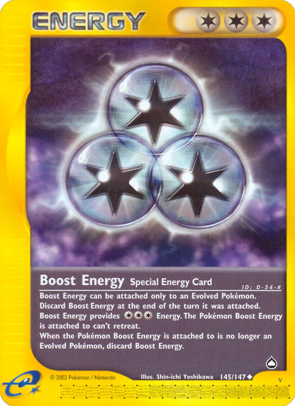 - Boost Energy can be attached only to an Evolved Pokémon. Discard Boost Energy at the end of the turn it was attached. Boost Energy provides ColorlessColorlessColorless Energy. The Pokémon Boost Energy is attached to can't retreat. When the Pokémon Boost Energy is attached to is no longer an Evolved Pokémon, discard Boost Energy.