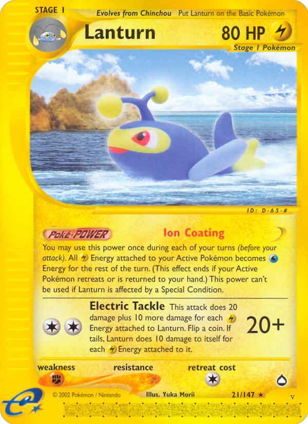 You may use this power once during each of your turns (before your attack). All Lightning Energy attached to your Active Pokémon becomes Water Energy for the rest of the turn. (This effect ends if your Active Pokémon retreats or is returned to your hand.) This power can't be used if Lanturn is affected by a Special Condition.