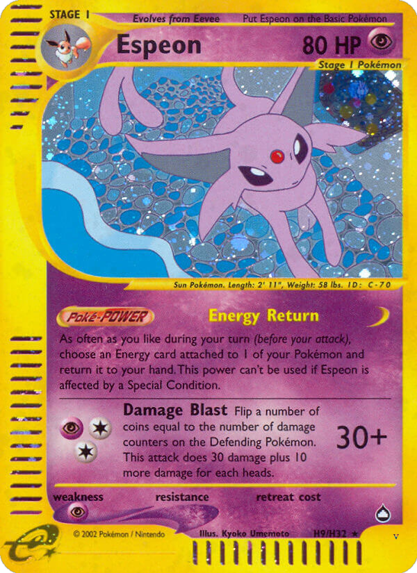 As often as you like during your turn (before your attack), choose an Energy card attached to 1 of your Pokémon and return it to your hand. This power can't be used if Espeon is affected by a Special Condition.