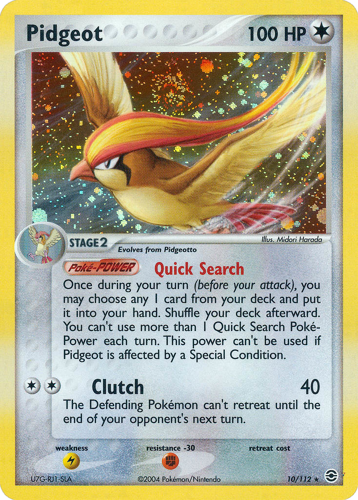 Once during your turn (before your attack), you may choose any 1 card from your deck and put it into your hand. Shuffle your deck afterward. You can't use more than 1 Quick Search Poké-Power each turn. This power can't be used if Pidgeot is affected by a Special Condition.