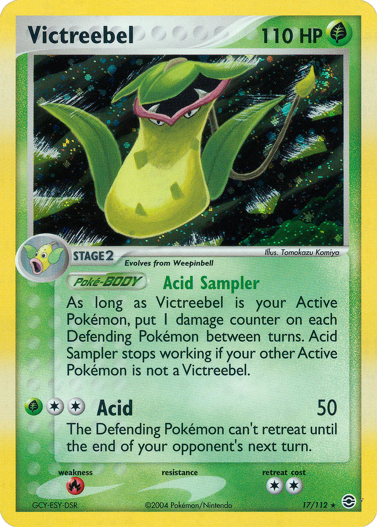 As long as Victreebel is your Active Pokémon, put 1 damage counter on each Defending Pokémon between turns. Acid Sampler stops working if your other Active Pokémon is not a Victreebel.