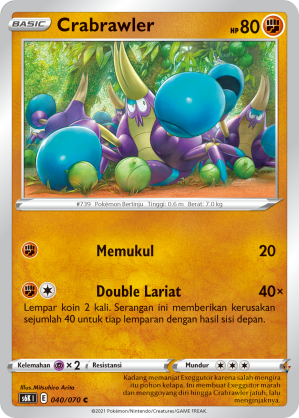 Kadang memanjat Exeggutor karena salah mengira itu pohon kelapa. Ini membuat Exeggutor marah dan menggoyang diri hingga Crabrawler jatuh, lalu menginjaknya.