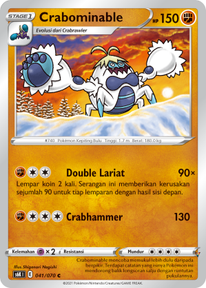Crabominable mencoba memukul lebih dulu daripada berpikir. Terdapat catatan yang isinya Pokémon ini mendorong balik longsoran salju dengan runtutan pukulannya.