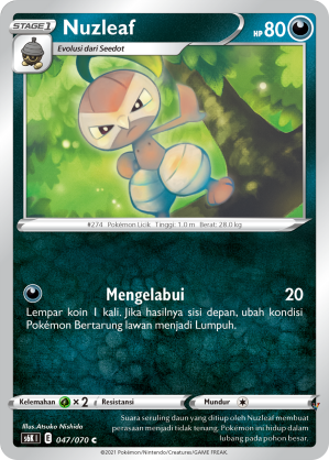 Suara seruling daun yang ditiup oleh Nuzleaf membuat perasaan menjadi tidak tenang. Pokémon ini hidup dalam lubang pada pohon besar.