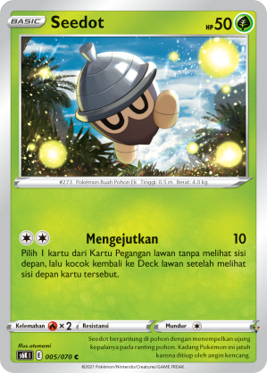 Seedot bergantung di pohon dengan menempelkan ujung kepalanya pada ranting pohon. Kadang Pokémon ini jatuh karena ditiup oleh angin kencang.