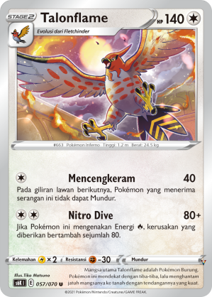Mangsa utama Talonflame adalah Pokémon Burung. Pokémon ini mendekat dengan tiba-tiba, lalu menghantam jatuh mangsanya ke tanah dengan tendangannya yang kuat.
