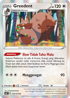 Greedent dapat menggerogoti cangkang beri sekeras apa pun menggunakan gigi kebanggaannya. Pokémon yang banyak ditemukan di Galar.