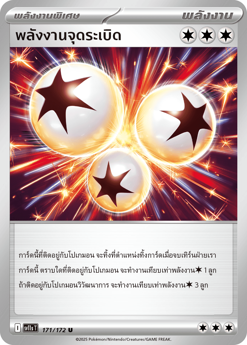 การ์ดนี้ที่ติดอยู่กับโปเกมอน จะทิ้งที่ตำแหน่งทิ้งการ์ดเมื่อจบเทิร์นฝ่ายเราการ์ดนี้ ตราบใดที่ติดอยู่กับโปเกมอน จะทำงานเทียบเท่าพลังงาน[ไร้สี] 1 ลูกถ้าติดอยู่กับโปเกมอนวิวัฒนาการ จะทำงานเทียบเท่าพลังงาน[ไร้สี] 3 ลูก