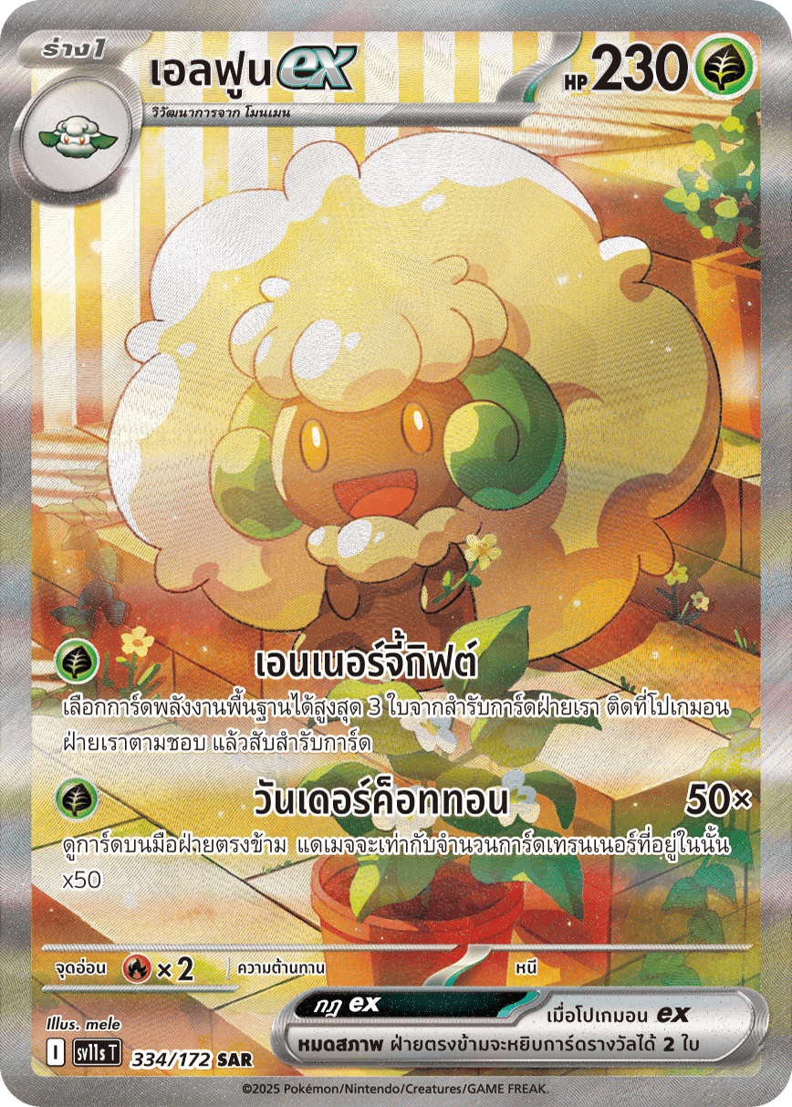 เลือกการ์ดพลังงานพื้นฐานได้สูงสุด 3 ใบจากสำรับการ์ดฝ่ายเรา ติดที่โปเกมอนฝ่ายเราตามชอบ แล้วสับสำรับการ์ด